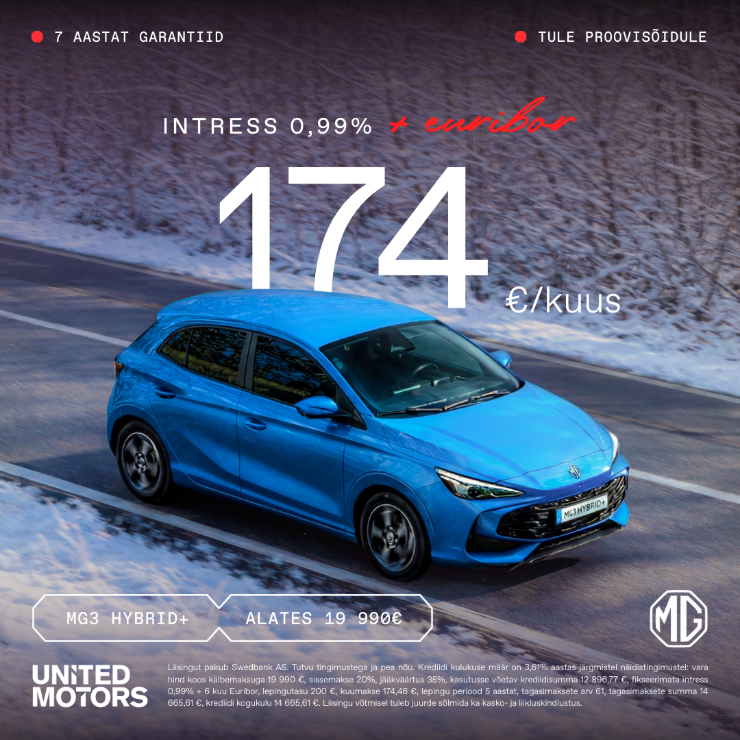 Uus MG3 Hybrid+ ühendab elektri ökonoomsuse ja bensiinimootori jõu, pakkudes särtsakat sõiduelamust ja madalat kütusekulu. Stiilne disain, nutikas tehnoloogia ning 7-aastane garantii teevad sellest ideaalse kaaslase linnas ja kaugemal.